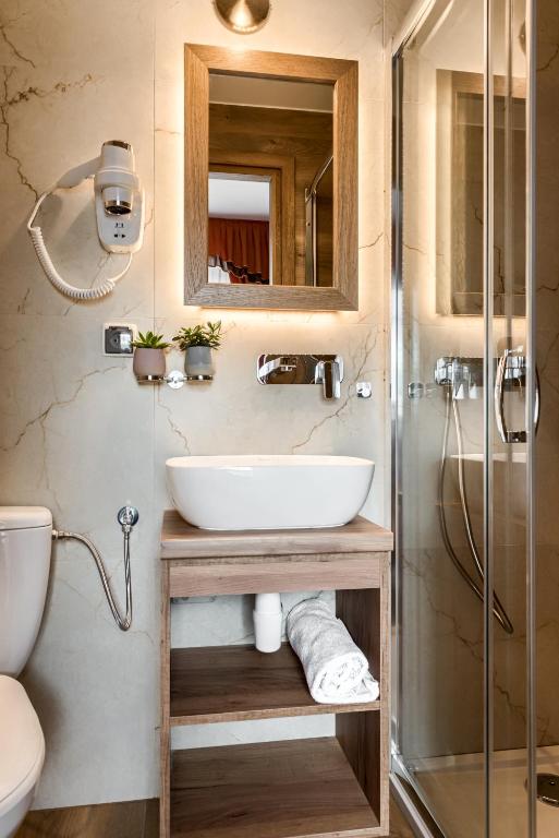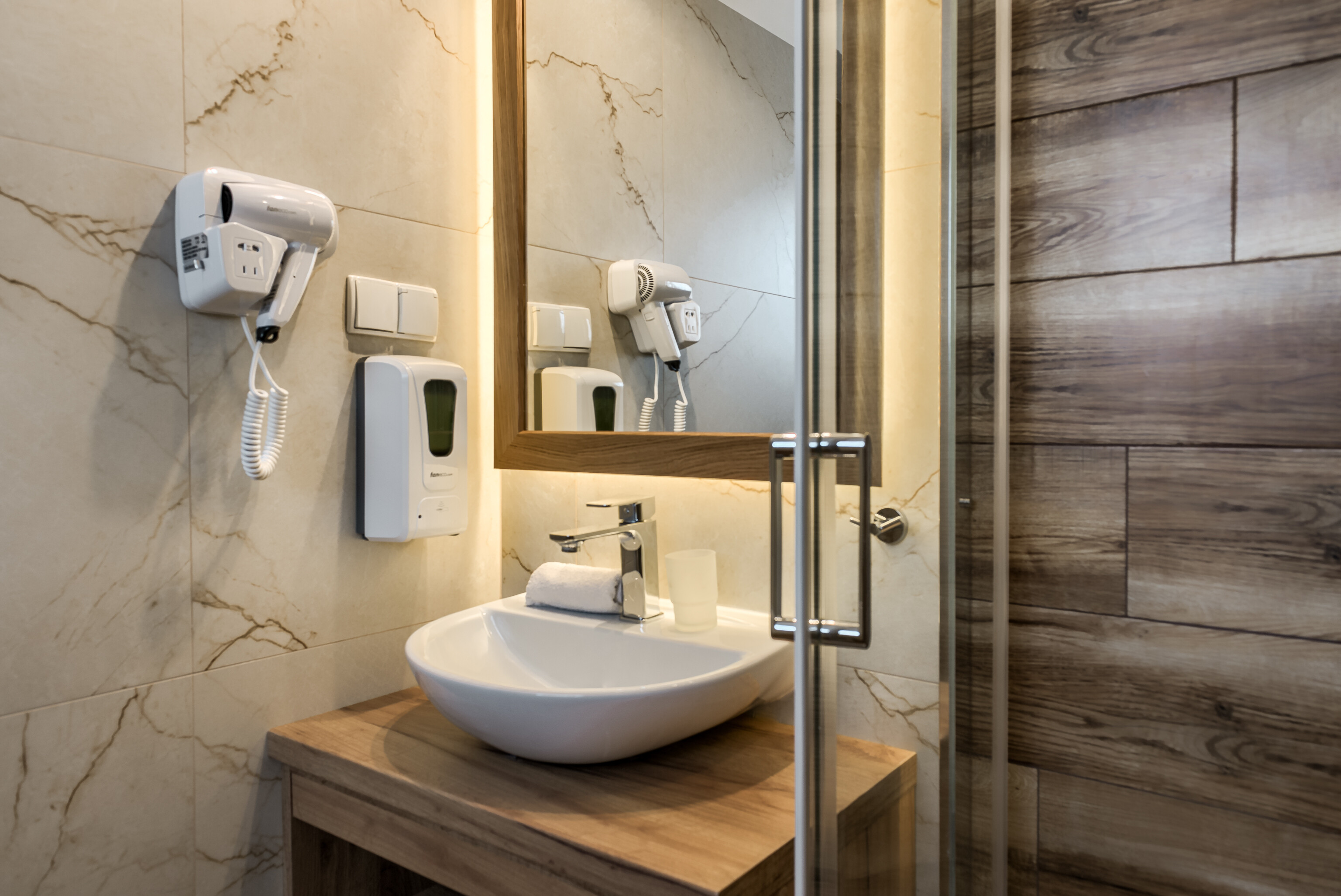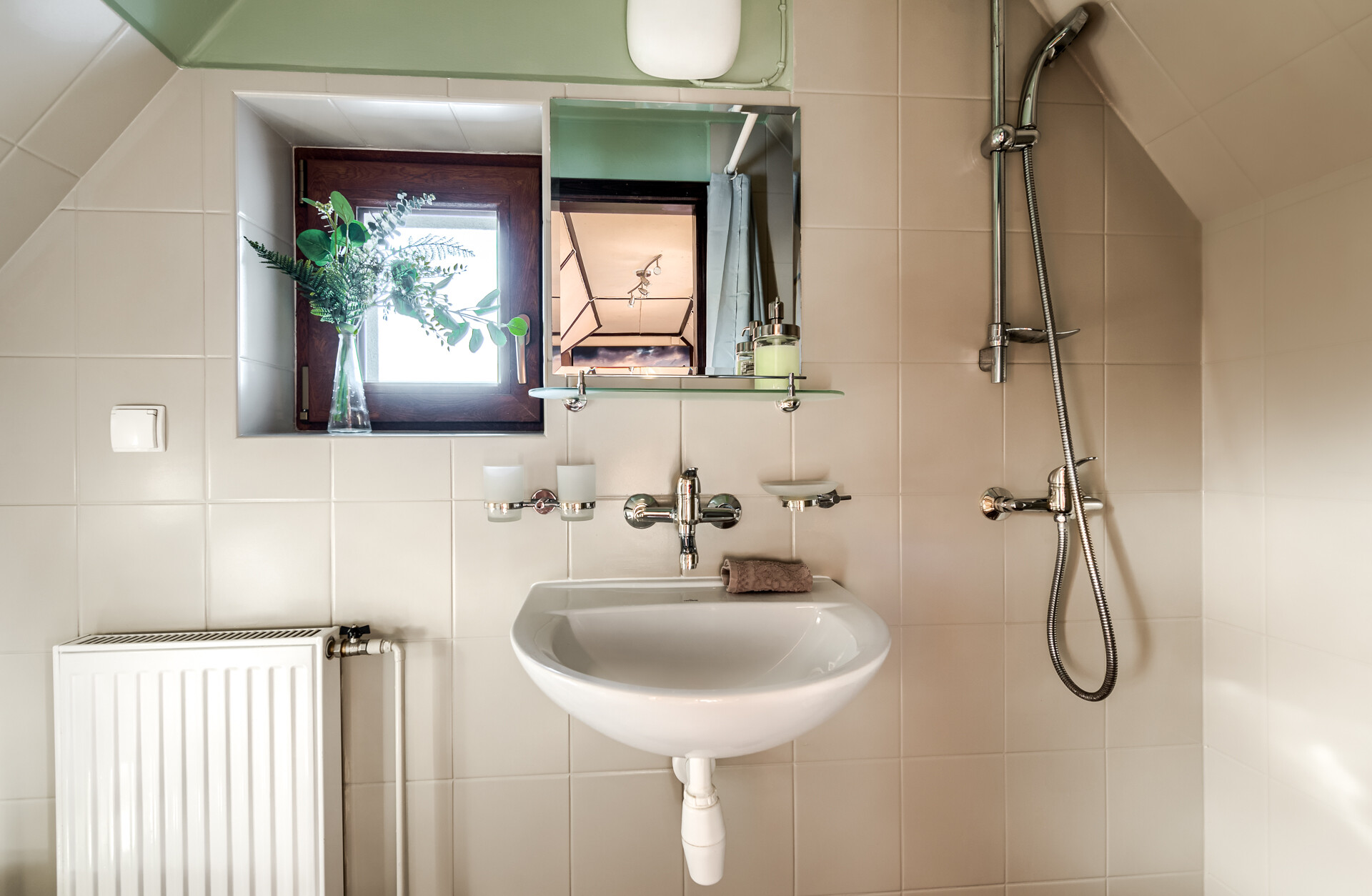 • Łazienka z prysznicem, suszarką, mydełkiem oraz ręcznikiem do rąk