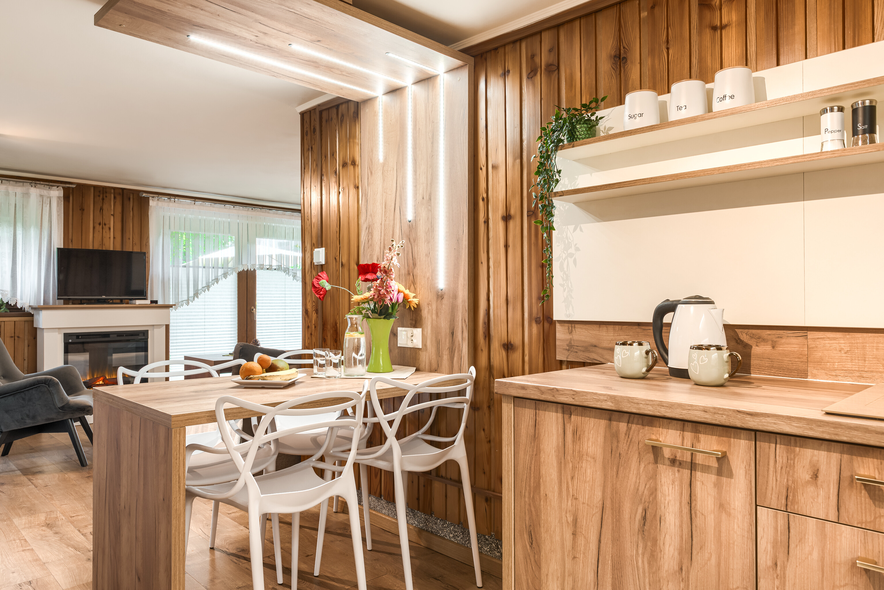 → Aneks kuchenny: miejsce, w którym można nie tylko zjeść ale też przygotować posiłek czy ciepły napój. Urządzona została w przytulnym, nowoczesnym stylu i wyposażona w praktyczne sprzęty codziennego użytku. Aneks dostępny jest dla wszystkich Gości Willi.