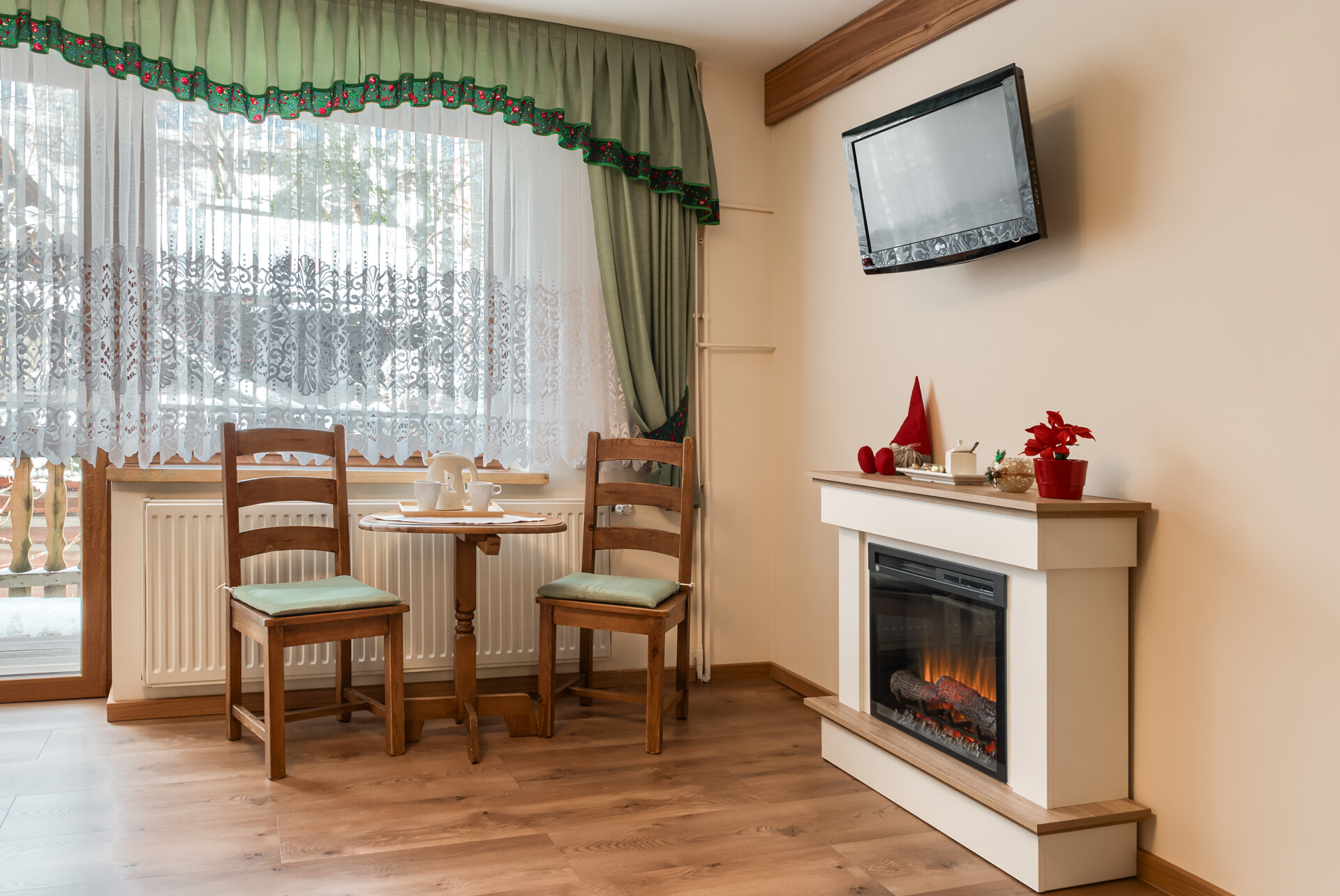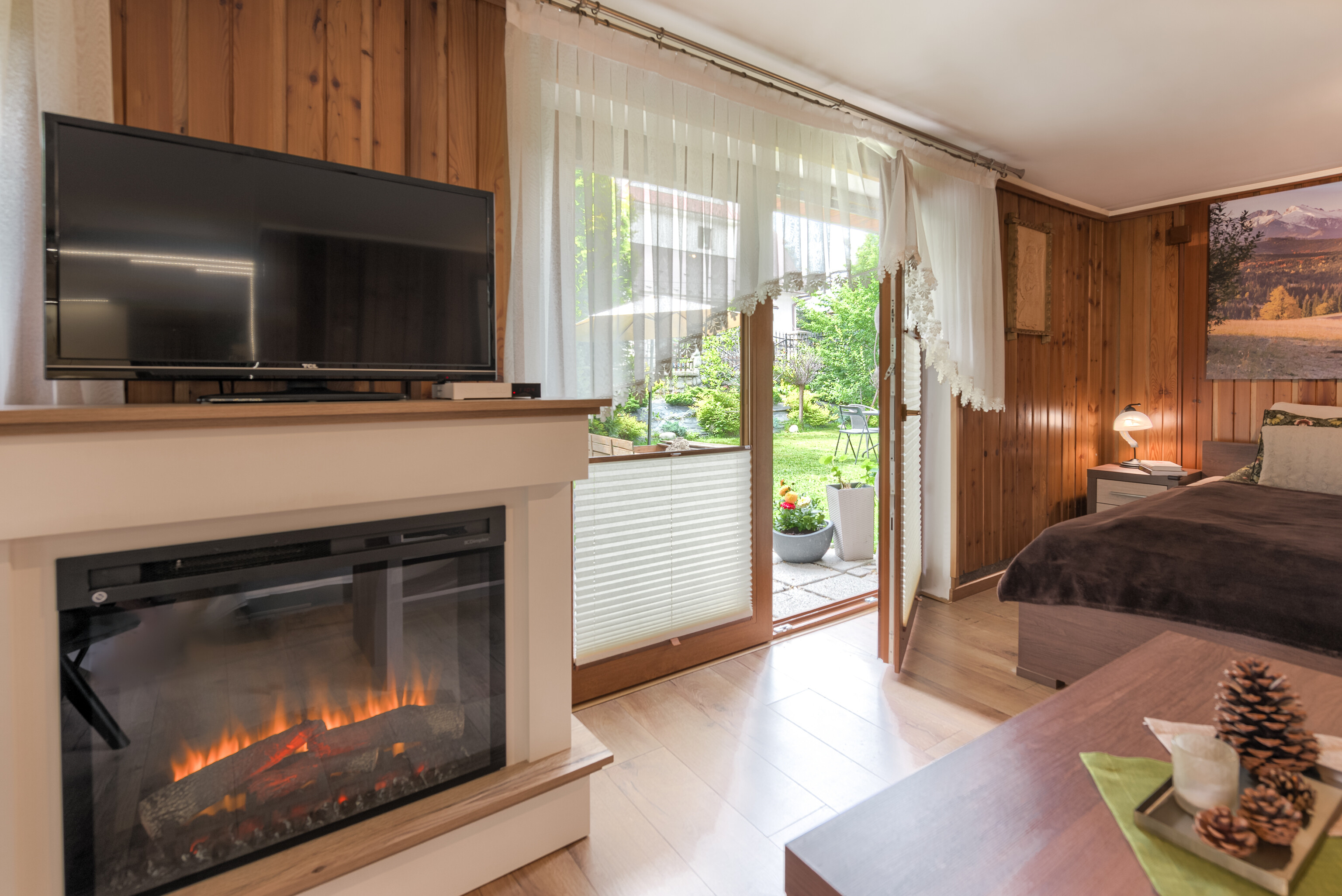 → Sala kominkowa: przytulne miejsce wieczornych spotkań. Tutaj można spędzić miły czas w gronie znajomych, a także zawrzeć nowe znajomości i podzielić się z pozostałymi Gośćmi swoimi doświadczeniami w Tatrach. W sezonie jesienno-zimowym przebywanie tutaj nabiera dodatkowego blasku, który wydobywa się prosto z rozpalonego kominka.